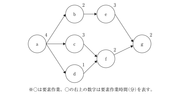 要素作業a~gの先行関係が下図に示される製品を、単一ラインで生産する。生産計画量が380個、稼働予定時間が40時間のとき、実行可能なサイクルタイムと最小作業工程数の組み合わせとして、最も適切なものを下記の解答群から選べ。