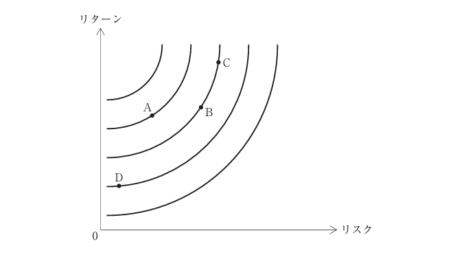以下の図は、横軸にリスク、縦軸にリターンを取ったリスク・リターン平面上に、資産Aから資産Dのそれぞれのリスクとリターンをプロットしたものである。このとき、図中にある無差別曲線を有する投資家が、保有する際に最も望ましいと考えられる資産として、最も適切なものを下記の解答群から選べ。