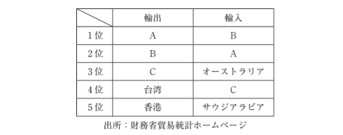 下表は、2019年における日本の貿易相手国上位5か国(地域を含む)を示している。表中の空欄A~Cに入る国の組み合わせとして、最も適切なものを下記の解答群から選べ。