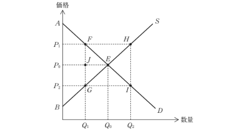 Q₂では供給過剰となり、価格が下がることで消費者余剰は一見増加するが、総余剰としては三角形EHIの分だけ損失が生じ、資源配分は非効率的になる。記述が正確。 - エ:×