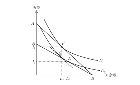 点Eから点Gへの変化は、実質所得の増加によって、正常財としての余暇の需要が増加する部分であり、「所得効果」という。