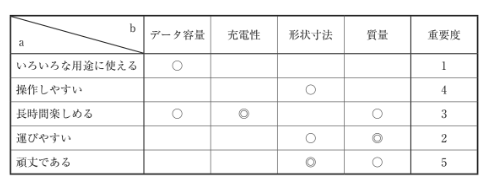 下表は、スマートフォンについて作成した品質表である。この表において表側aは 、表頭bは を表す。それらの対応関係は、◎と○で示される。