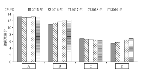 グラフ内の空欄A~Dには、百貨店、スーパー、コンビニエンスストア、ドラッグストアのいずれかが入る。