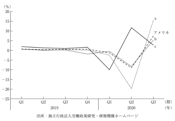 2020年4−6月期(Q2)の落ち込みが極端に大きく、前期比の下落幅が他国よりも顕著。7−9月期(Q3)には大幅に反発するが、依然として水準の不安定さが目立つ。英国はロックダウン影響が深く、急落・急反発の形が特徴的。 - b:日本