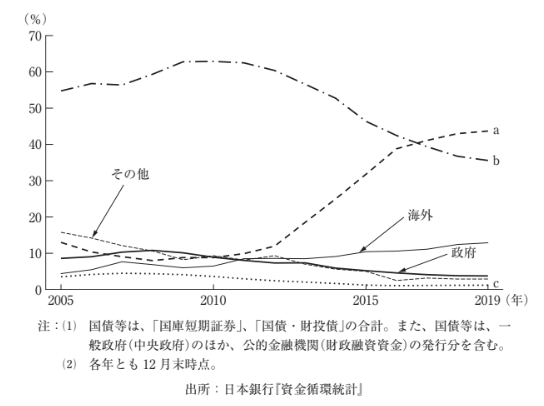 銀行・保険・年金などの保有比率は、中央銀行の買入拡大に伴って相対的に低下。ただし依然として高めのシェアを維持する中位の折れ線が b。2005〜2010頃は高水準、その後じわり低下。 - c:個人