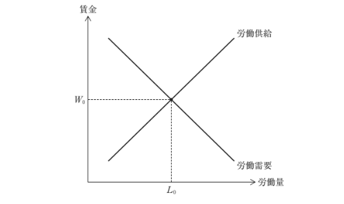 均衡賃金 W0 より高い最低賃金は価格下限となり、需要より供給が多くなって超過供給=失業が発生(図の交点L0より左側で需要量が減少・供給量が増加)。