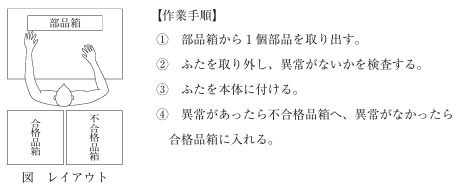 部品箱、合格品箱、不合格品箱の配置を見ると、すべて正常作業域に配置されているため、レイアウトは改善しなくてよい。