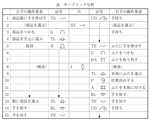 • 分析表の読み方: 連続する保持・手待ち・移動要素の塊を見つけ、対策(治具化・標準手順)に直結させる。