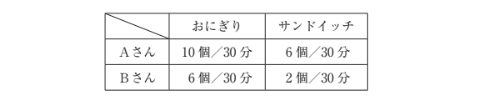 下表に示すように、Aさんは30分間で、おにぎりであれば10個、サンドイッチであれば6個作ることができる。