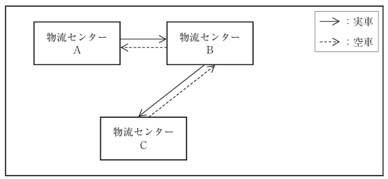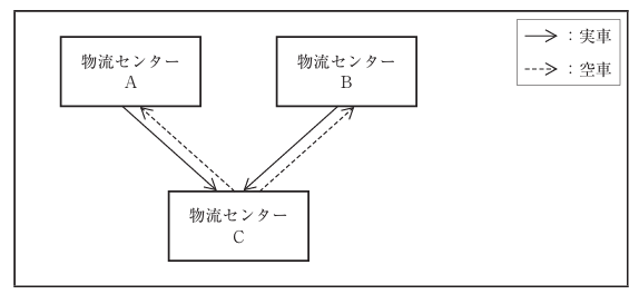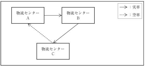 トラックの積載率を改善させるために、取組案aとbを検討している。現状では、物流センターAと物流センターBからそれぞれ別々にトラック1台が走行し、物流センターCへ納品しており、各物流センターから輸送する際の実車の積載率は50%未満である。(下図参照)