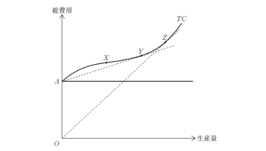 下図は企業の短期費用曲線を示し、縦軸のOAが固定費用を表している。ここで、総費用曲線TC上の接線のうち、①その傾きが最小となる点をX、②Aを起点とした直線と接する点をY、③Oを起点とした直線と接する点をZとする。