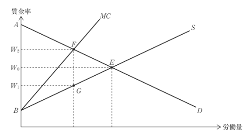 労働市場が完全競争である場合と比べて、三角形 EFG だけの余剰が失われている。