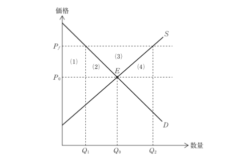 貿易自由化による生産者余剰の増加分は、⑴、⑵、⑶、⑷の合計である。
