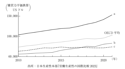 図中のa~cに該当する国の組み合わせとして、最も適切なものを下記の解答群から選べ。