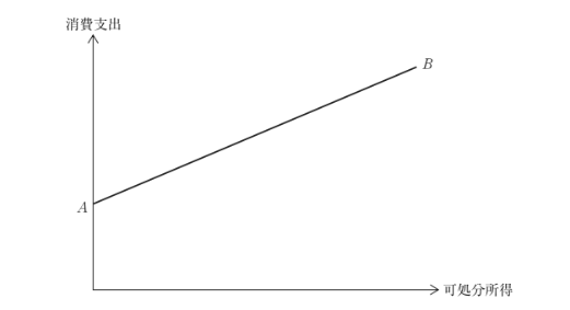 直線ABは限界消費性向が一定であることを示す。原点を通らない場合、独立消費が存在する。