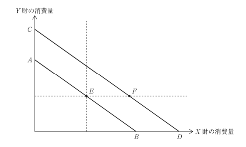 下図は、ある個人の予算制約線を描いている。当初の予算制約線はABであり、このとき、この個人は点Eで決まる数量のX財とY財を消費している。所得の増加によって予算制約線はCDとなり、このとき、この個人は点Fで決まる数量のX財とY財を消費している。