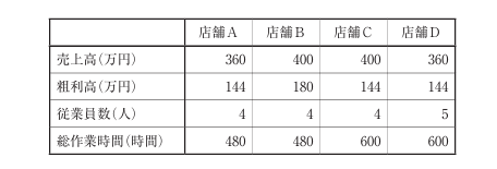 下表は、4つの店舗における、ある期間の売上高、粗利高、従業員数、総作業時間をまとめたものである。各店舗で作業を効率化するためのシステムを導入し、1人当たりの作業時間を変えずに従業員を1人ずつ減らした場合、売上高と粗利高が変わらないとすると、システム導入前と比べて人時生産性で最も改善額が大きい店舗を下記の解答群から選べ。なお、ここで人時生産性は粗利高で算出するものとする。