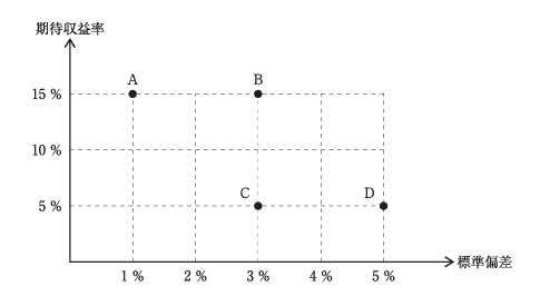 以下の図は、縦軸に投資の期待収益率、横軸に当該投資収益率の標準偏差をとった平面上に、資産Aから資産Dのそれぞれのリスクとリターンをプロットしたものである。